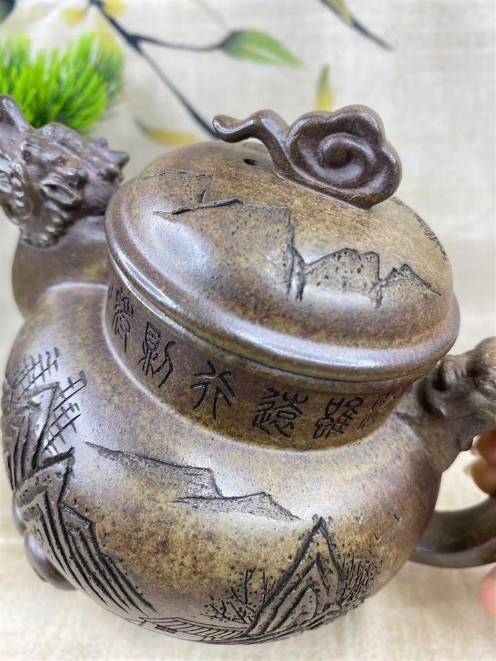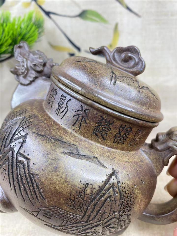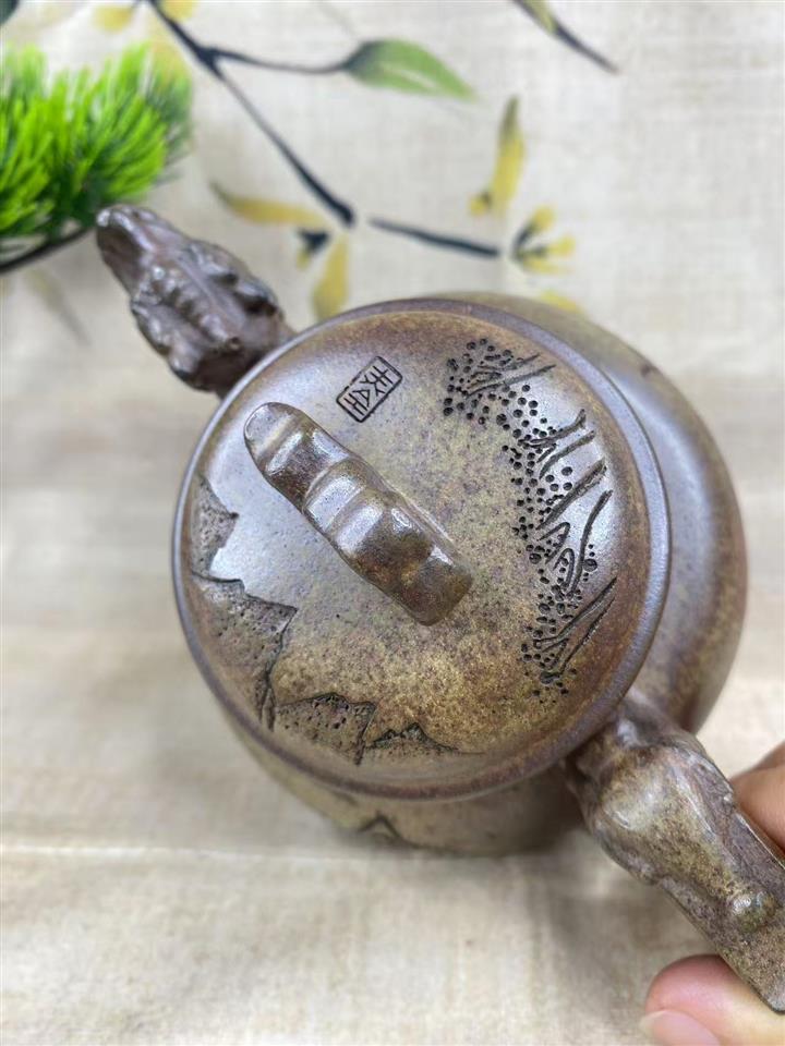 原礦紫砂君子蘭刻繪漢鐸茶壺POT7517
