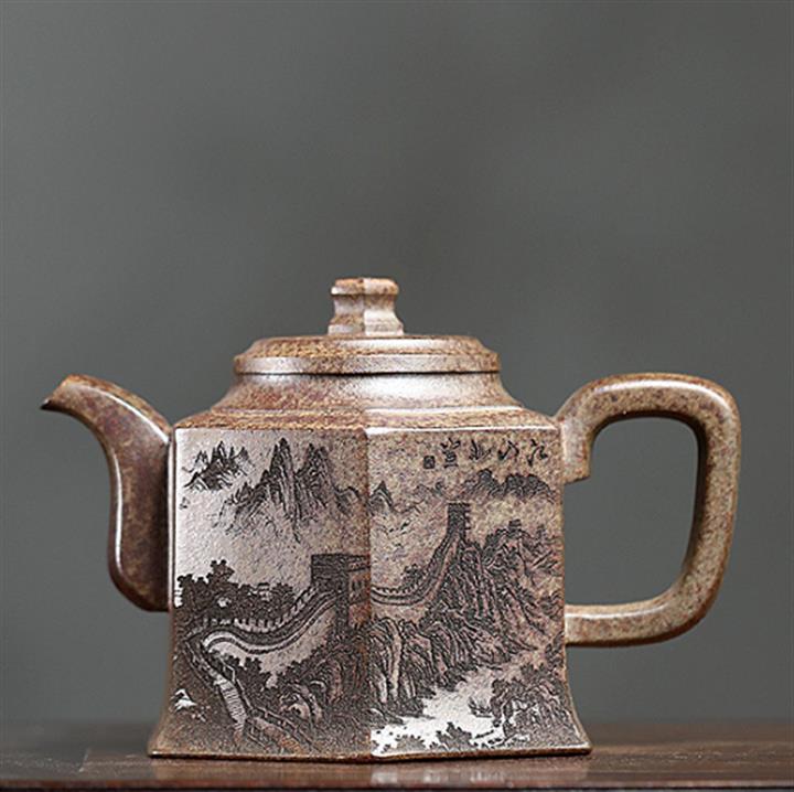 原礦玄鐵石黃六方溪山茶壺POT7579