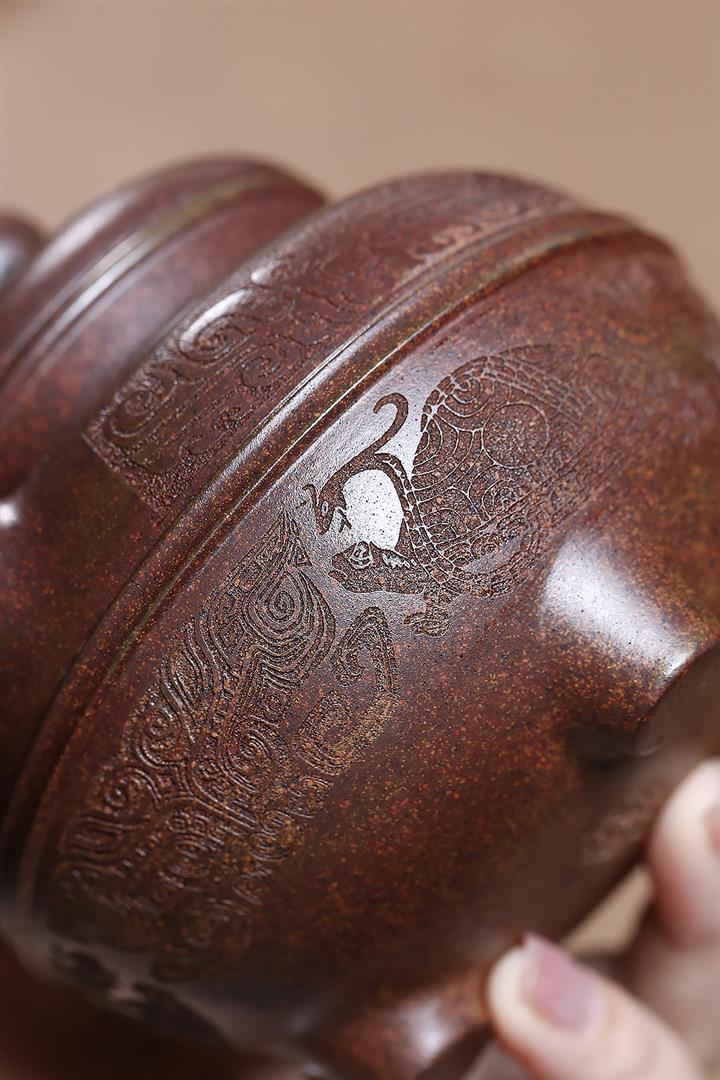 【作品介紹】作品深蘊內涵,做工細致典雅,型用完備,器形端莊穩重,比例協調,結構嚴謹,泥色潤澤。