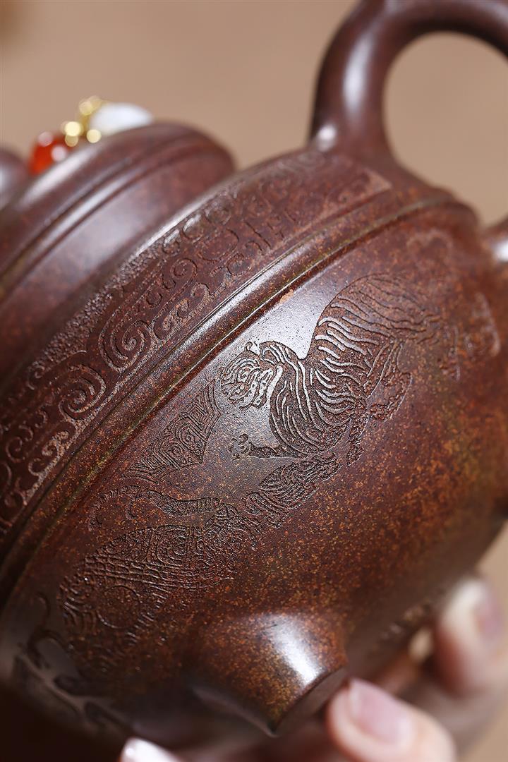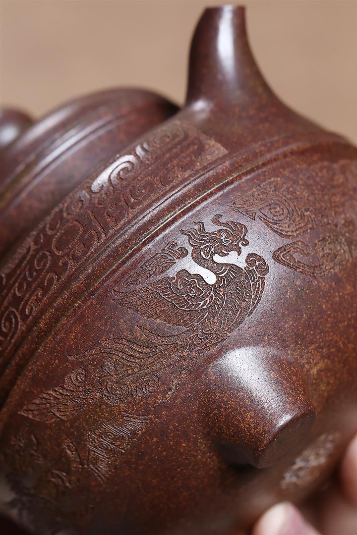 原礦玄鐵石黃刻繪覓香苑曲壺POT7592
