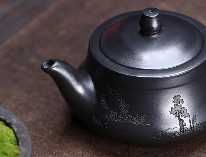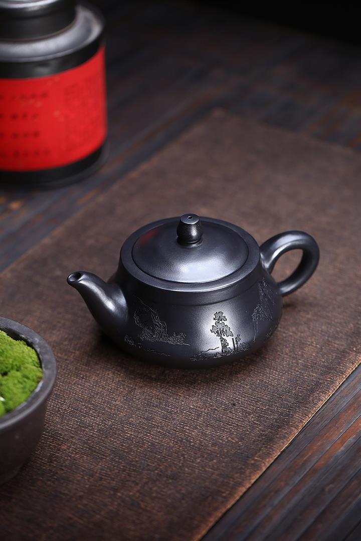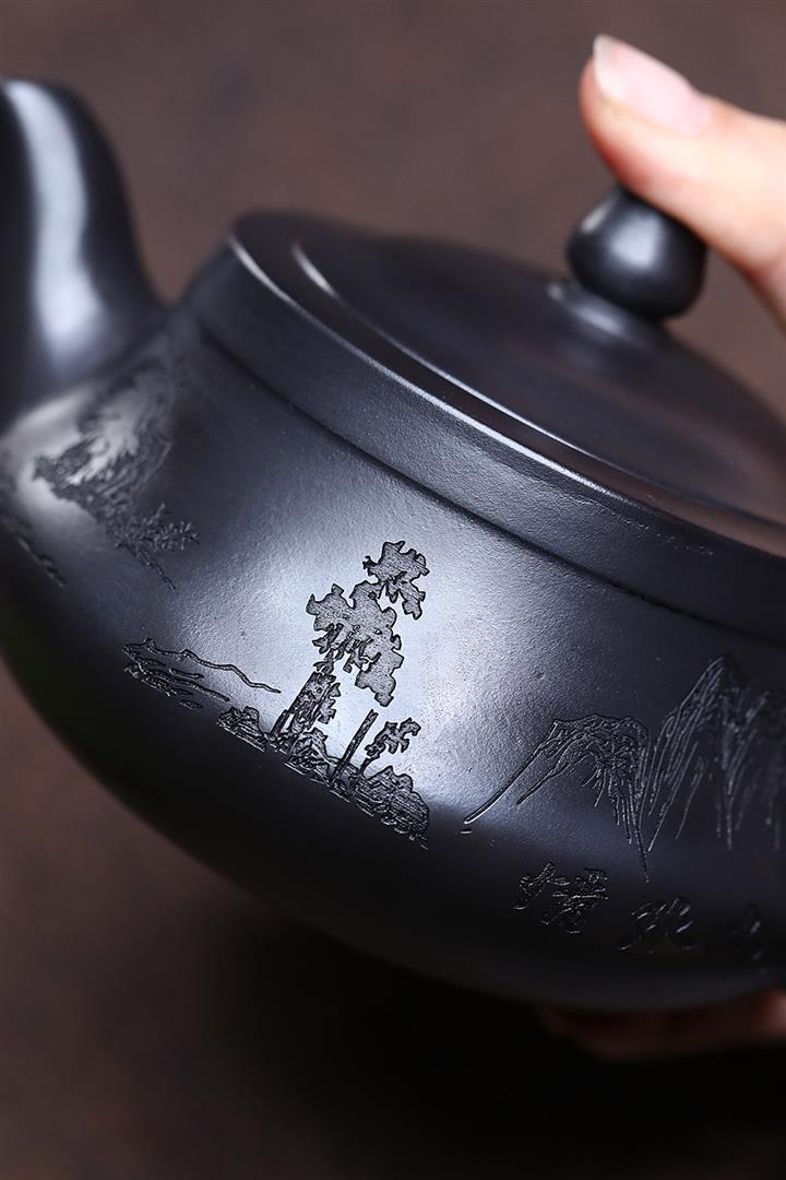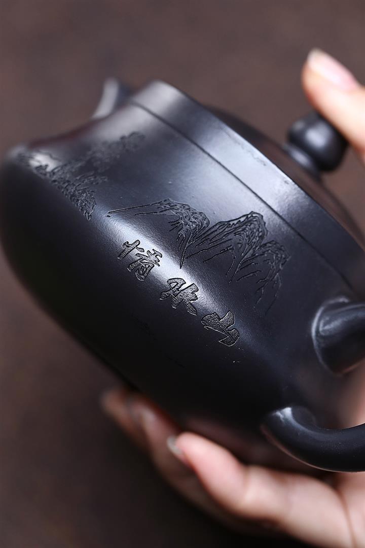 原礦石黃刻繪山水曲壺茶壺POT7683