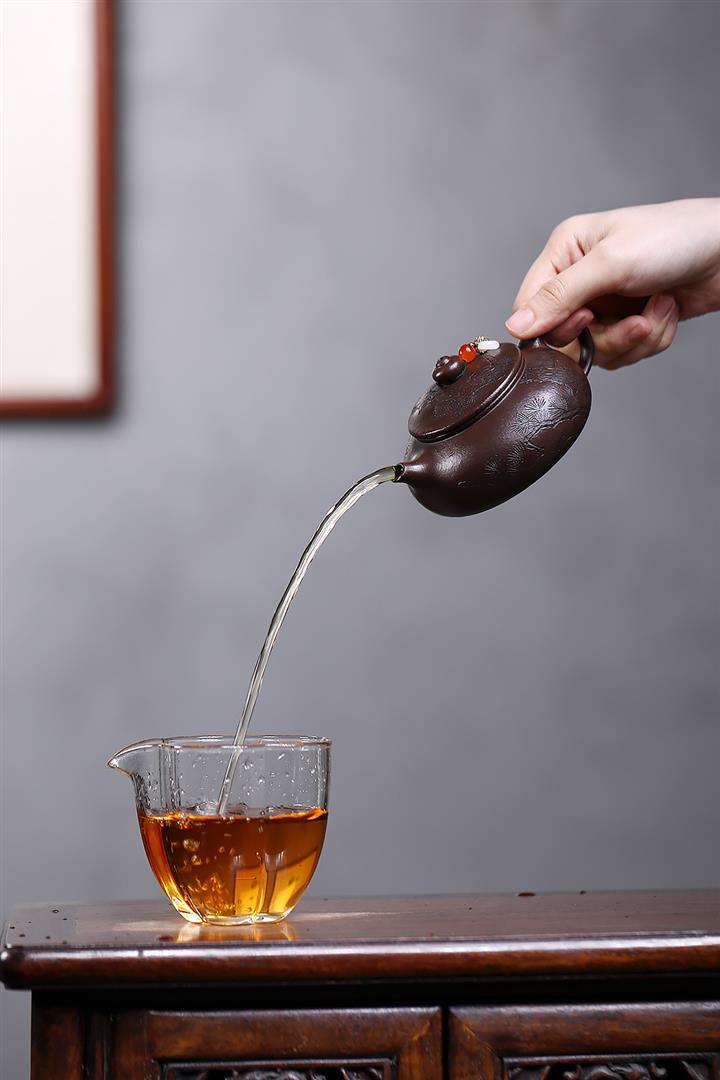 【泥料特點】砂土氣重,似淳實農民,日久使用,漸露鋒芒,養成變化,溫潤莊重。紫砂是壹種雙重氣孔結構的多孔性材質,氣孔微細,密度高。用紫砂壺沏茶,不失原味,且香不渙散,得茶之真香真味。紫砂使用越久,壺身色澤越發光亮照人,氣韻溫雅。紫砂壺長久使用器身會因撫摸擦拭,變得越發溫潤光澤。
