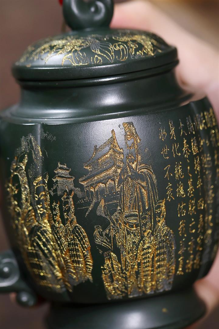 原礦綠泥千裏江山臥虎藏龍漢瓦壺POT7843