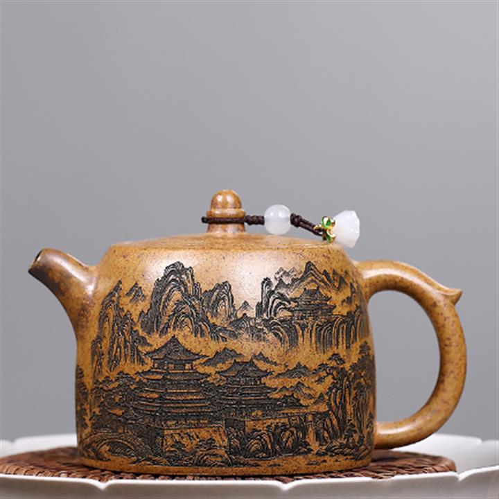 原礦石黃泥龍紋扁腹滿刻茶壺POT7723