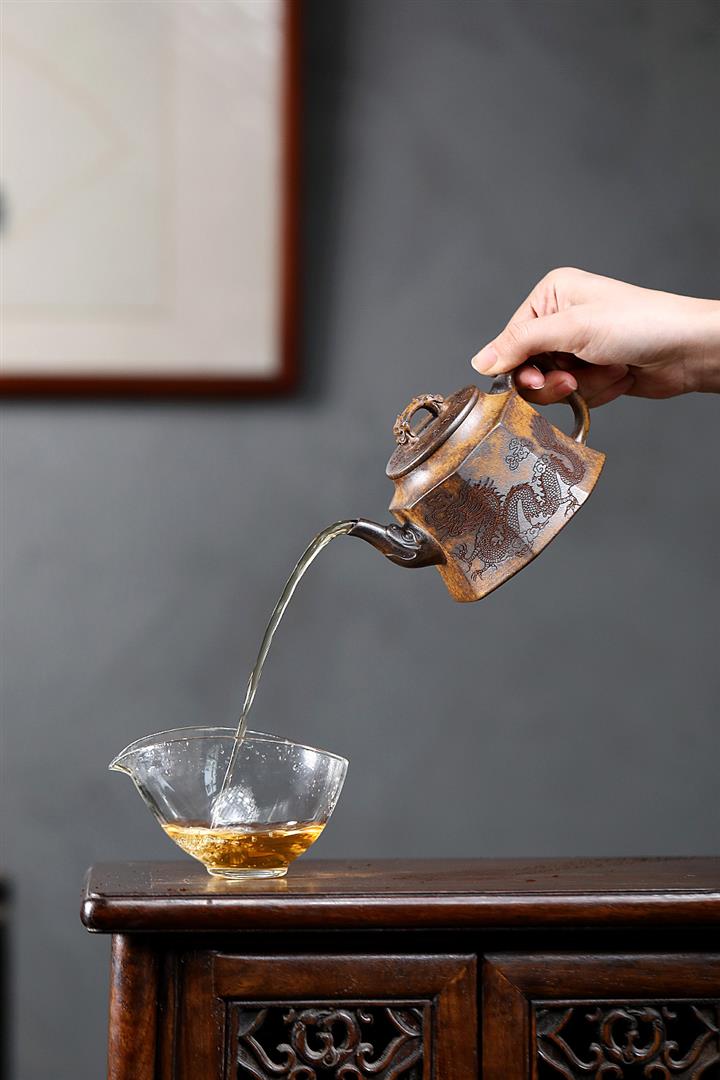 【泥料特點】砂土氣重,似淳實農民,日久使用,漸露鋒芒,養成變化,溫潤莊重。紫砂是壹種雙重氣孔結構的多孔性材質,氣孔微細,密度高。用紫砂壺沏茶,不失原味,且香不渙散,得茶之真香真味。紫砂使用越久,壺身色澤越發光亮照人,氣韻溫雅。紫砂壺長久使用器身會因撫摸擦拭,變得越發溫潤光澤。