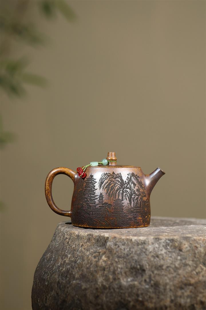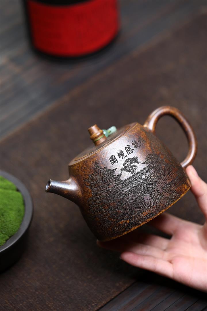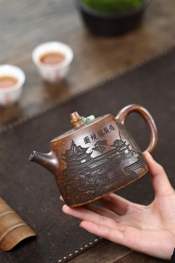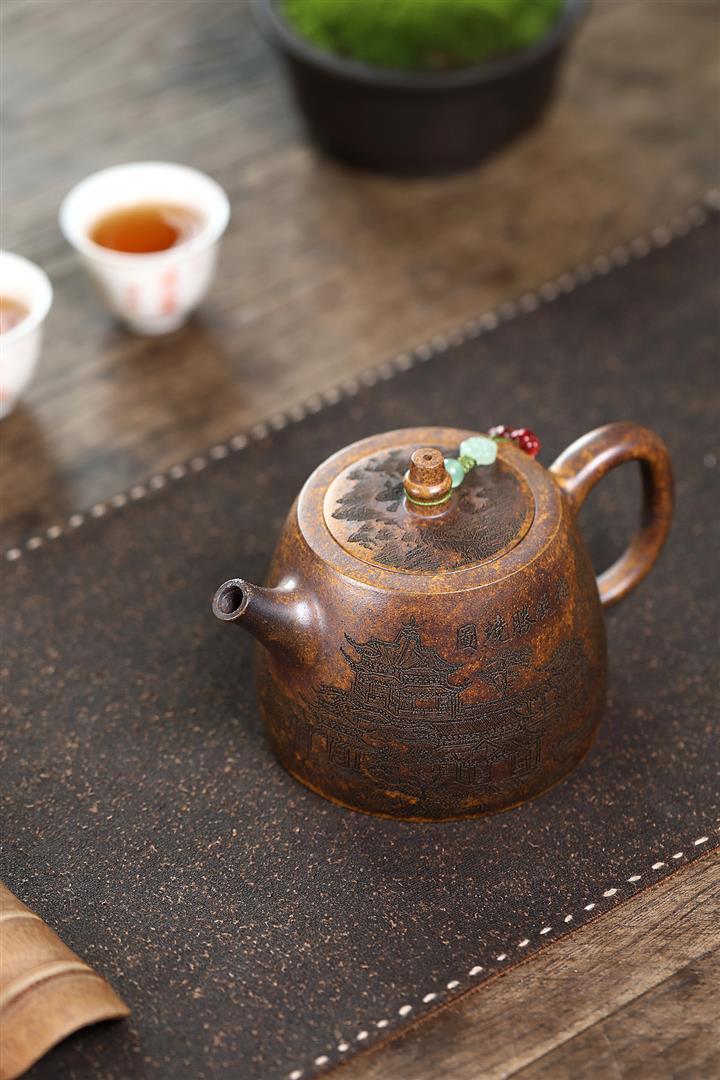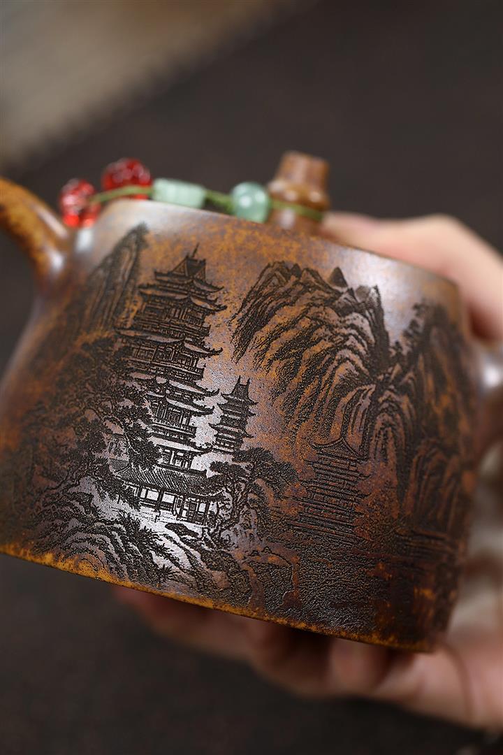 400cc原礦綠泥滿刻江山如畫壺POT7982