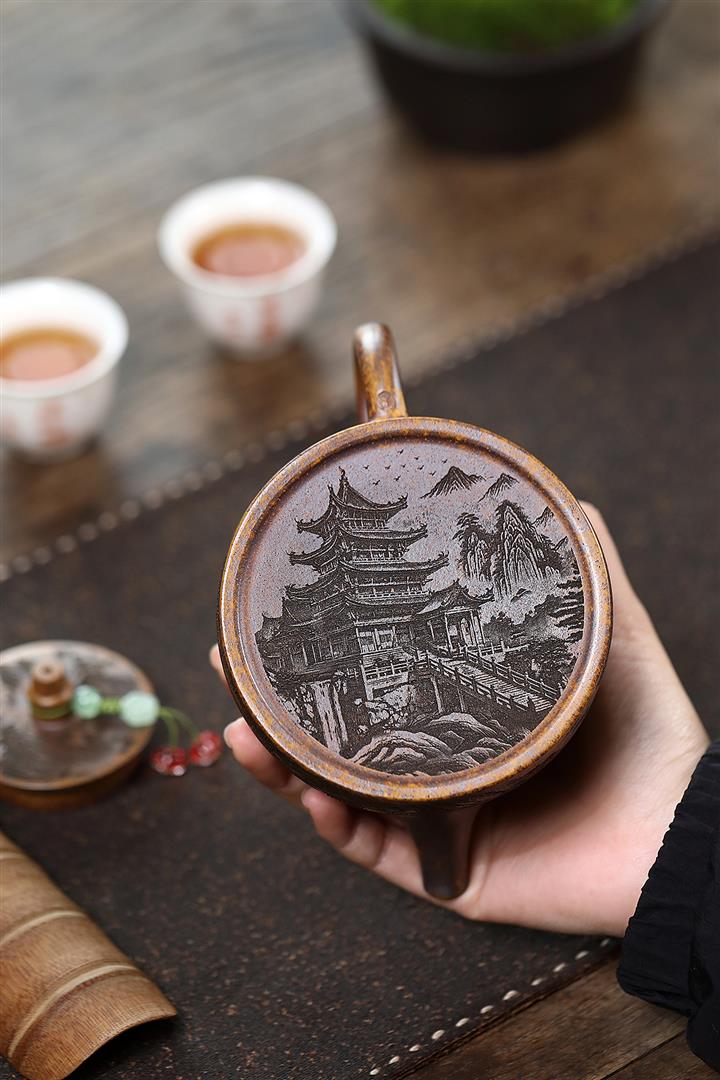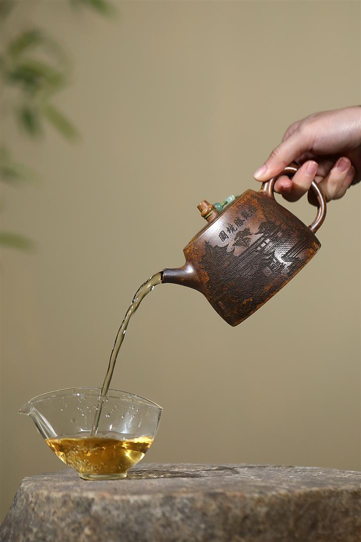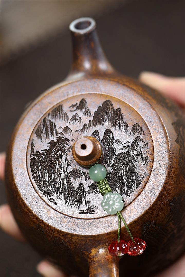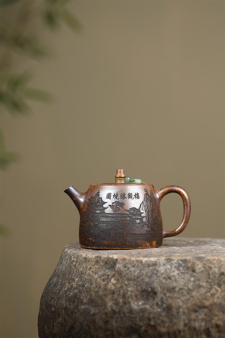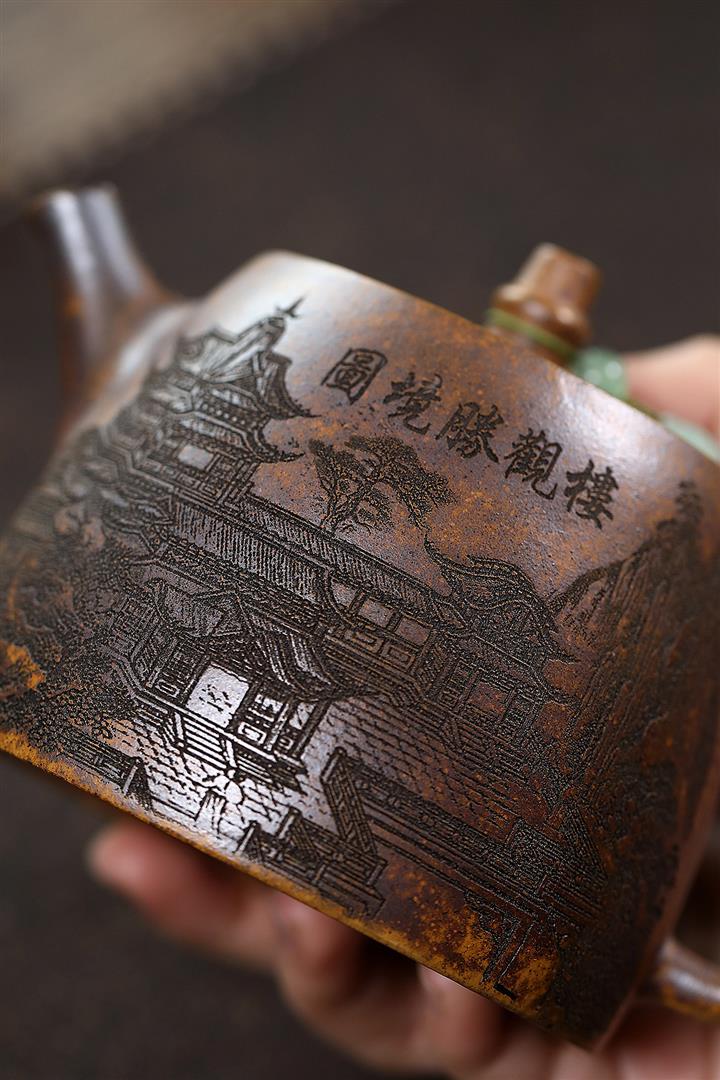 400cc原礦綠泥滿刻江山如畫壺POT7982