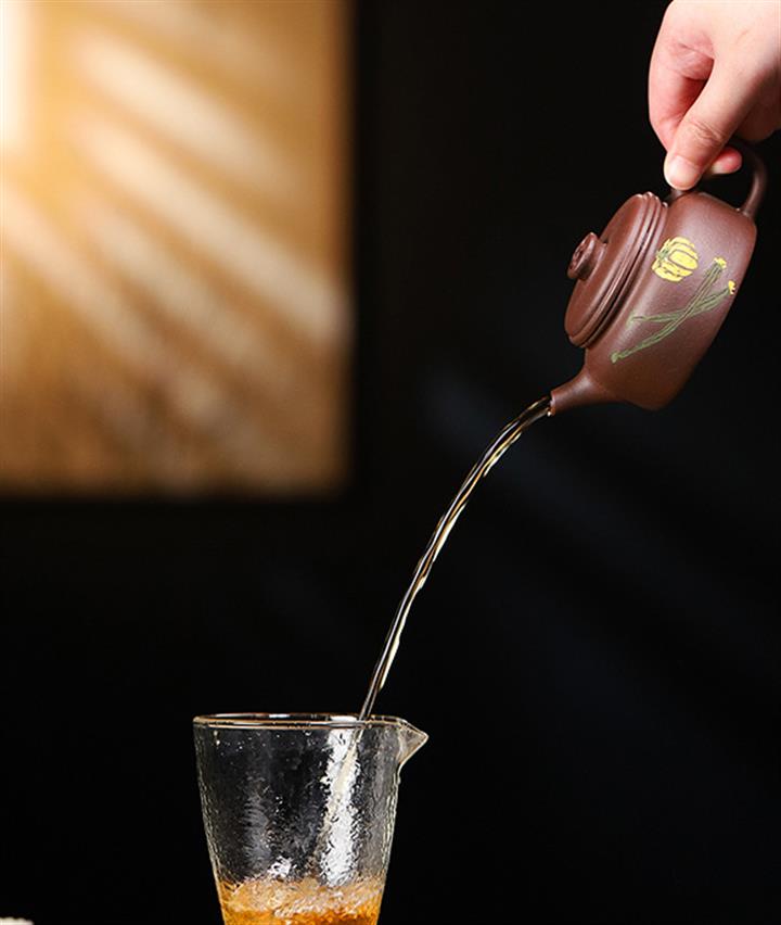 【泥料特點】砂土氣重,似淳實農民,日久使用,漸露鋒芒,養成變化,溫潤莊重。紫砂是壹種雙重氣孔結構的多孔性材質,氣孔微細,密度高。用紫砂壺沏茶,不失原味,且香不渙散,得茶之真香真味。紫砂使用越久,壺身色澤越發光亮照人,氣韻溫雅。紫砂壺長久使用器身會因撫摸擦拭,變得越發溫潤光澤。